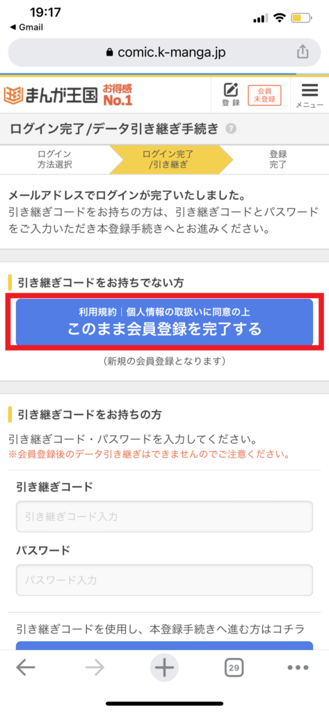 登録URLを選択するとまんが王国へのログインが完了します。画面に表示されている[このまま会員登録を完了する]ボタンを選択すれば会員登録は完了です。